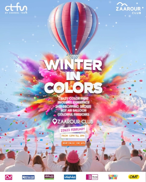 Dates: February 22 & 23 Time: From 12pm Till 3pm Location: Zaarour Club For Kids Aged from 3 and above Pricing: 35$ Per Kid 15$ Per Adult Food and Beverage not included